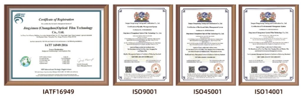 Jingyimen je certifikován mnoha autoritativními systémy doma i v zahraničí, včetně systému řízení jakosti IATF 16949, systému řízení jakosti ISO 9001,ISO 14001 Systém environmentálního managementu, ISO 45001 Systém managementu bezpečnosti a ochrany zdraví při práci a SGS. Jsme partnery pro různé standardy čínského automobilového průmyslu PPF a okenních fólií, působíme jako lídr v několika asociacích automobilového trhu s náhradními díly v Číně a získali jsem různá průmyslová vyznamenání.