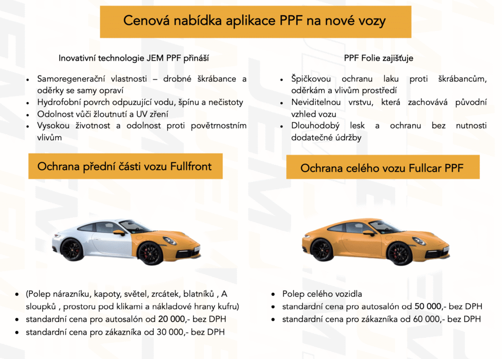 JEM PPF s.r.o. je výhradní dovozce ochranných fólii PPF vyráběných společnosti JEM. Od roku 2025 se stala naše společnost výhradním zastoupením značky JEM pro Českou republiku, Slovenskou republiku a Polsko. Nabízíme veškerou dokumentaci, technologii a kvalitu, která je zaručena dlouholetými zkušenostmi asijského trhu. Z důvodu přímého napojení na výrobce jsme schopni nabídnou výrobu všech druhů PPF fólii na objednávku dle požadavků klienta. Zajištujeme veškerou dokumentaci od pojištění, naložení, dopravu, odbavení, vyložení a dovoz na místo určení dle požadavků klienta.